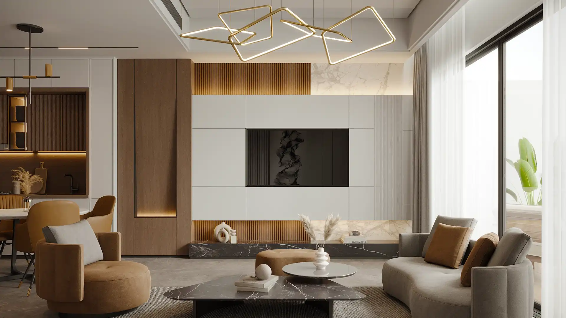 – Built-in European-branded appliances (microwave, hob, oven, refrigerator) & washing machine.